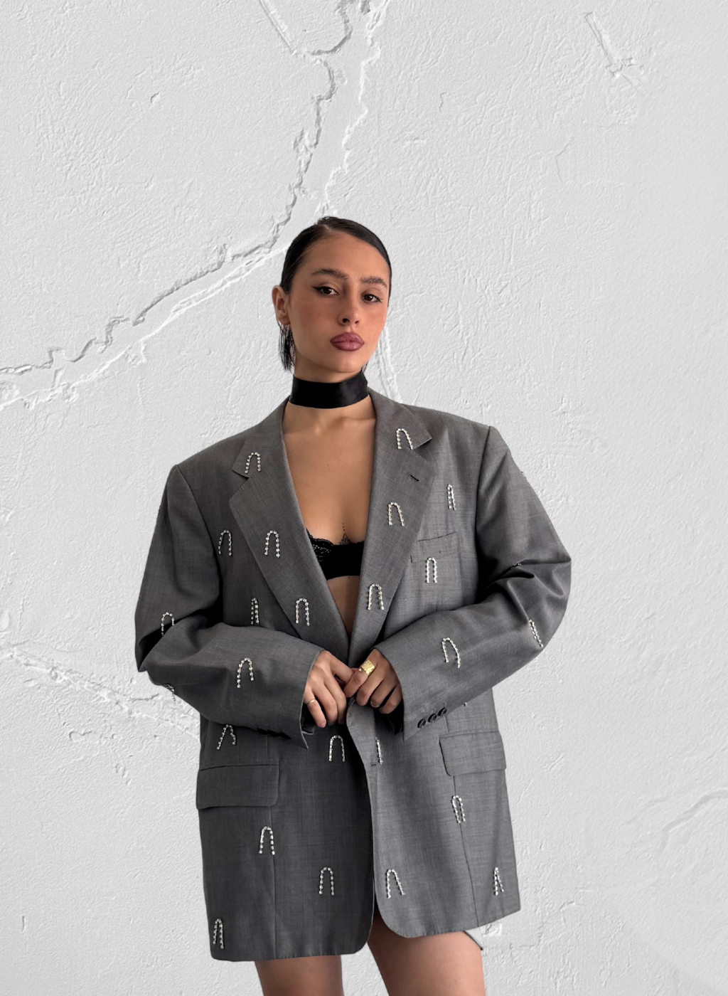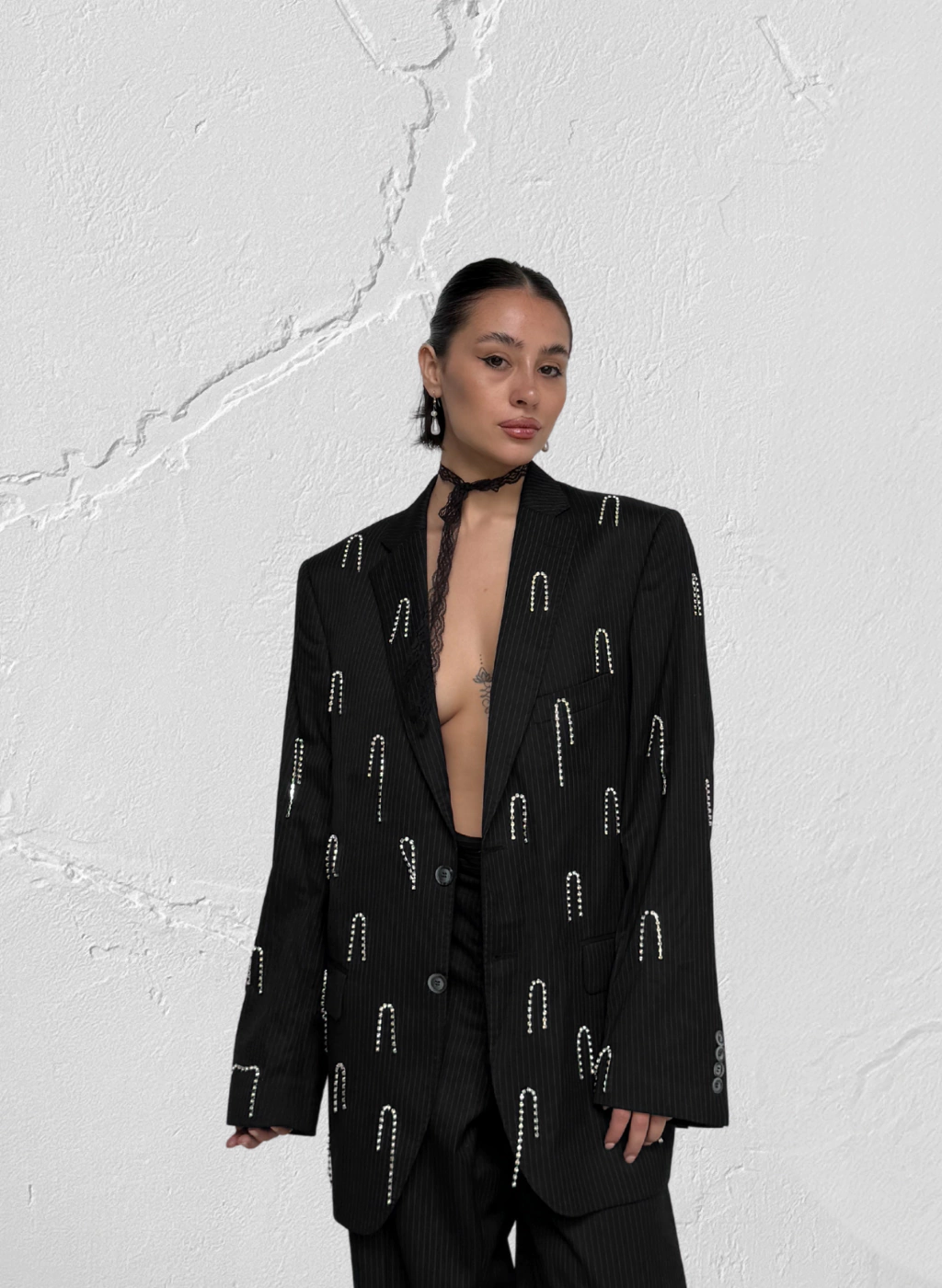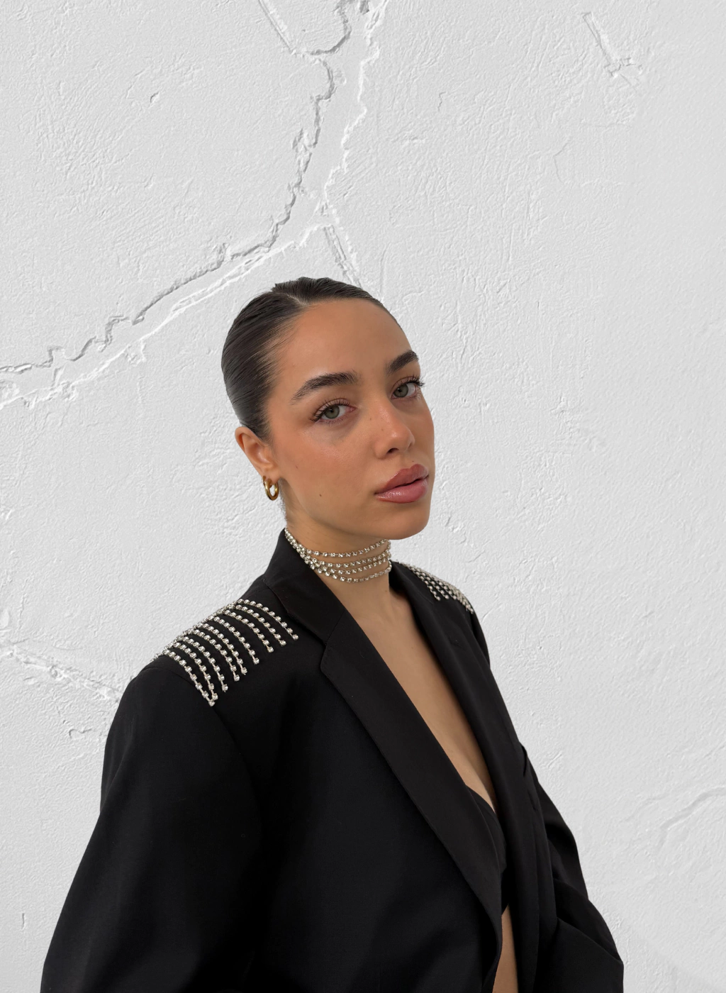 2. Pequeñas tiras de strass bordadas en frente, brazos y espalda.
