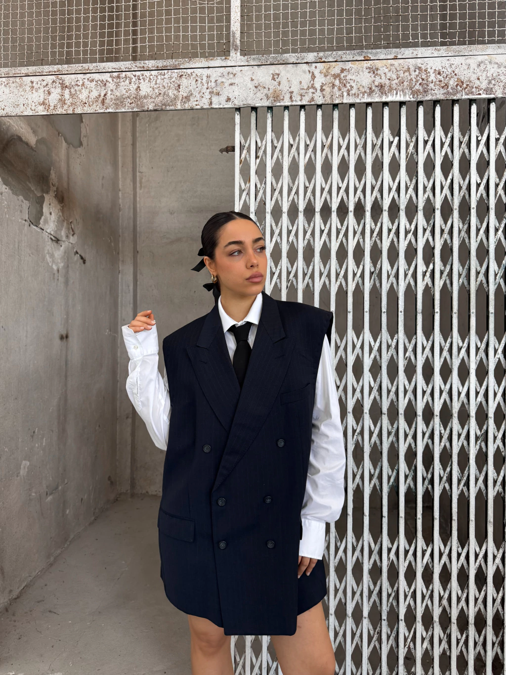 Descubrí el Amour Vintage Vest, una pieza de archivo que combina el poder del tailoring con la elegancia atemporal. Confeccionado por Pierre Cardin utilizando un textil de alta calidad en color azul oscuro con finas líneas. Presenta hombros estructurados, forrería interna satinada y botones a tono. Esta prenda fue seleccionada para formar parte de nuestro archivo por su calidad, terminaciones impecables y diseño atemporal.