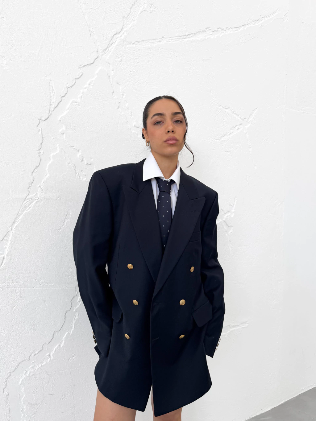 Descubrí el Yves Saint Laurent Vintage Blazer, una pieza de archivo que combina el poder del tailoring con la elegancia atemporal. Confeccionado por el diseñador Yves Saint Laurent en 100% lana merino extra fina de alta calidad, en color azul oscuro. Presenta hombros estructurados, forrería interna satinada con las iniciales de la marca y botones color oro con las iniciales de la marca grabadas. Esta prenda fue seleccionada para formar parte de nuestro archivo por su calidad, terminaciones impecables y diseño atemporal. Precioso!