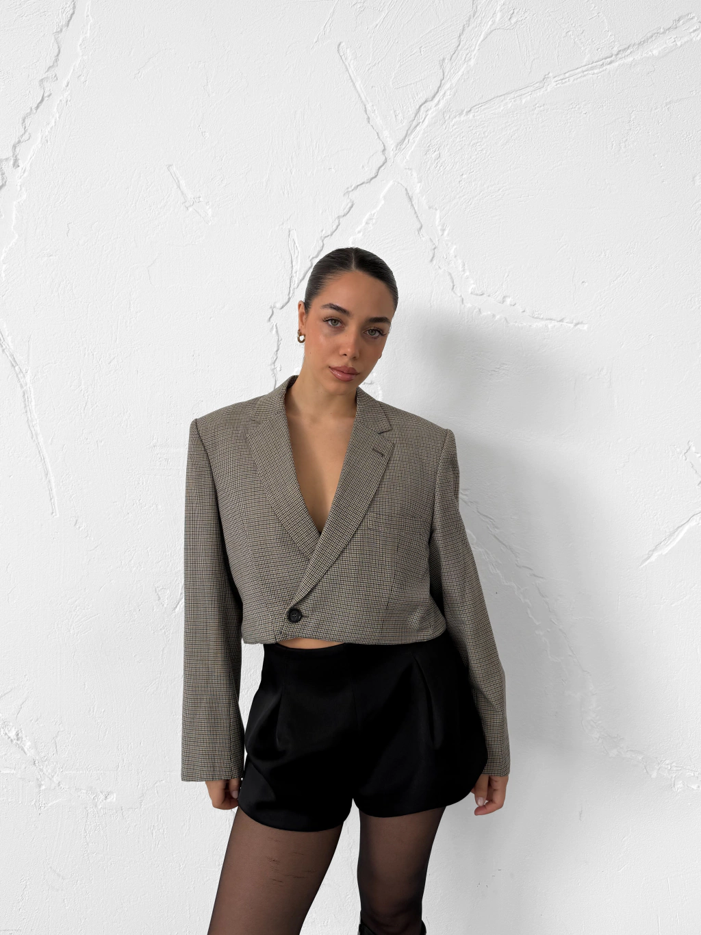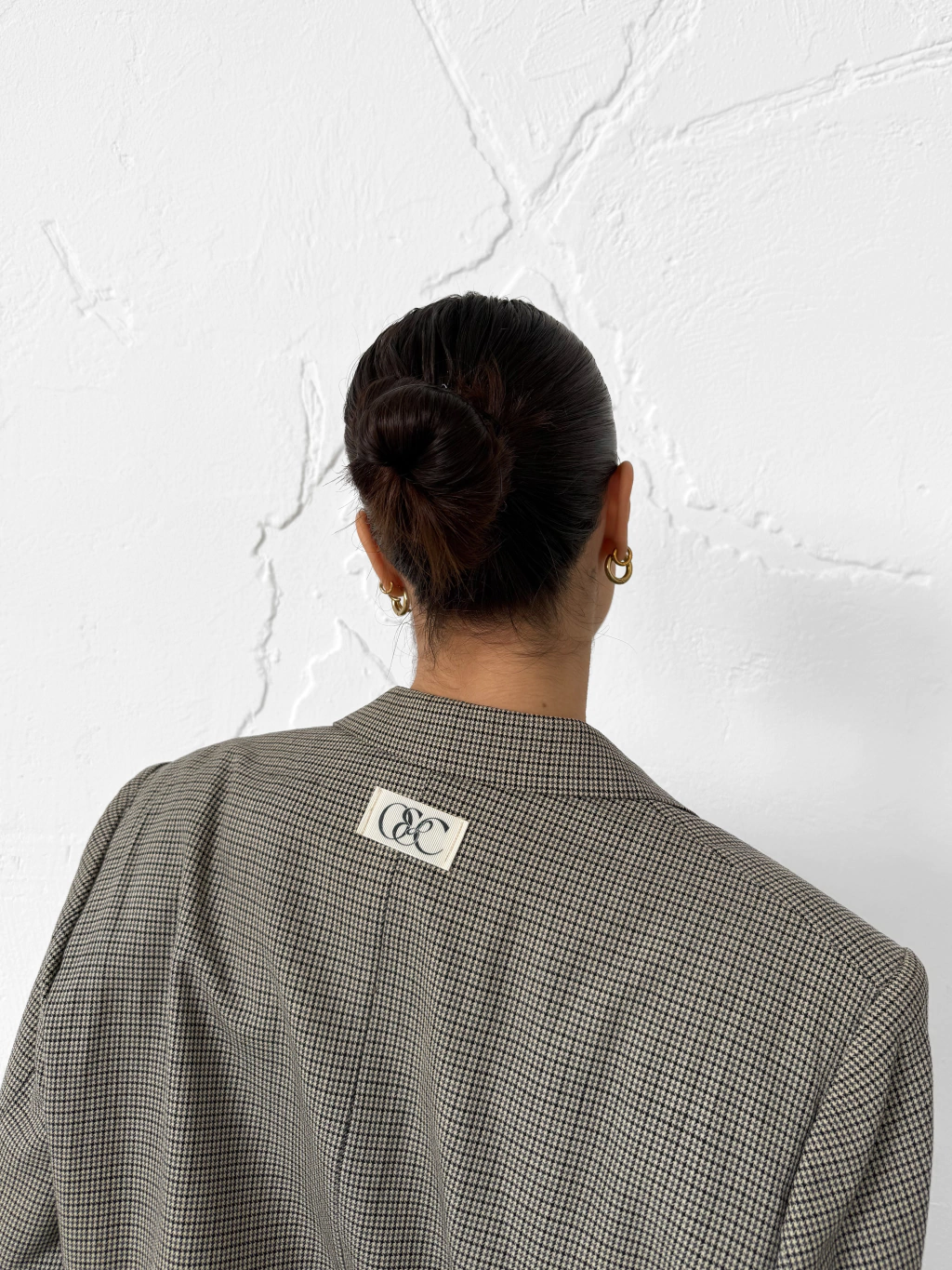 Descubrí el Blazer Carpaccio, una pieza de archivo que combina el poder del tailoring con la elegancia atemporal. Confeccionado utilizando textiles de primera calidad en Pied de Poule color negro, gris y beige, presenta hombros estructurados, forrería interna satinada y botones a tono. Esta prenda fue seleccionada para formar parte de nuestro archivo por su calidad, terminaciones impecables y diseño atemporal.