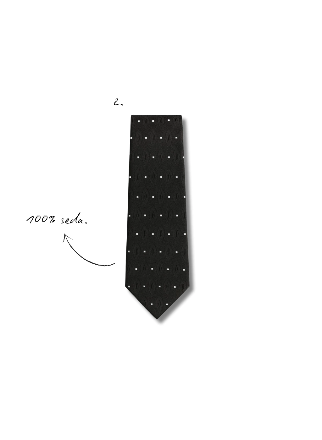 2. Negro, con detalles satinados en el mismo tono y cuadraditos blancos. 100% seda natural.