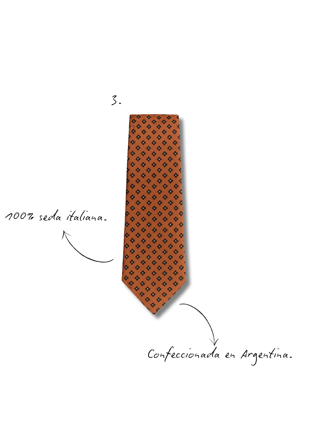 3. Color ladrillo, con flores negras y lunares crudo. 100% seda italiana. Confeccionada en Argentina.
