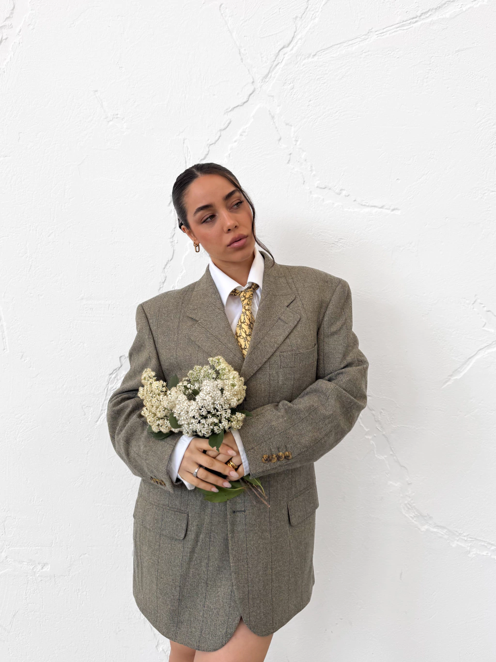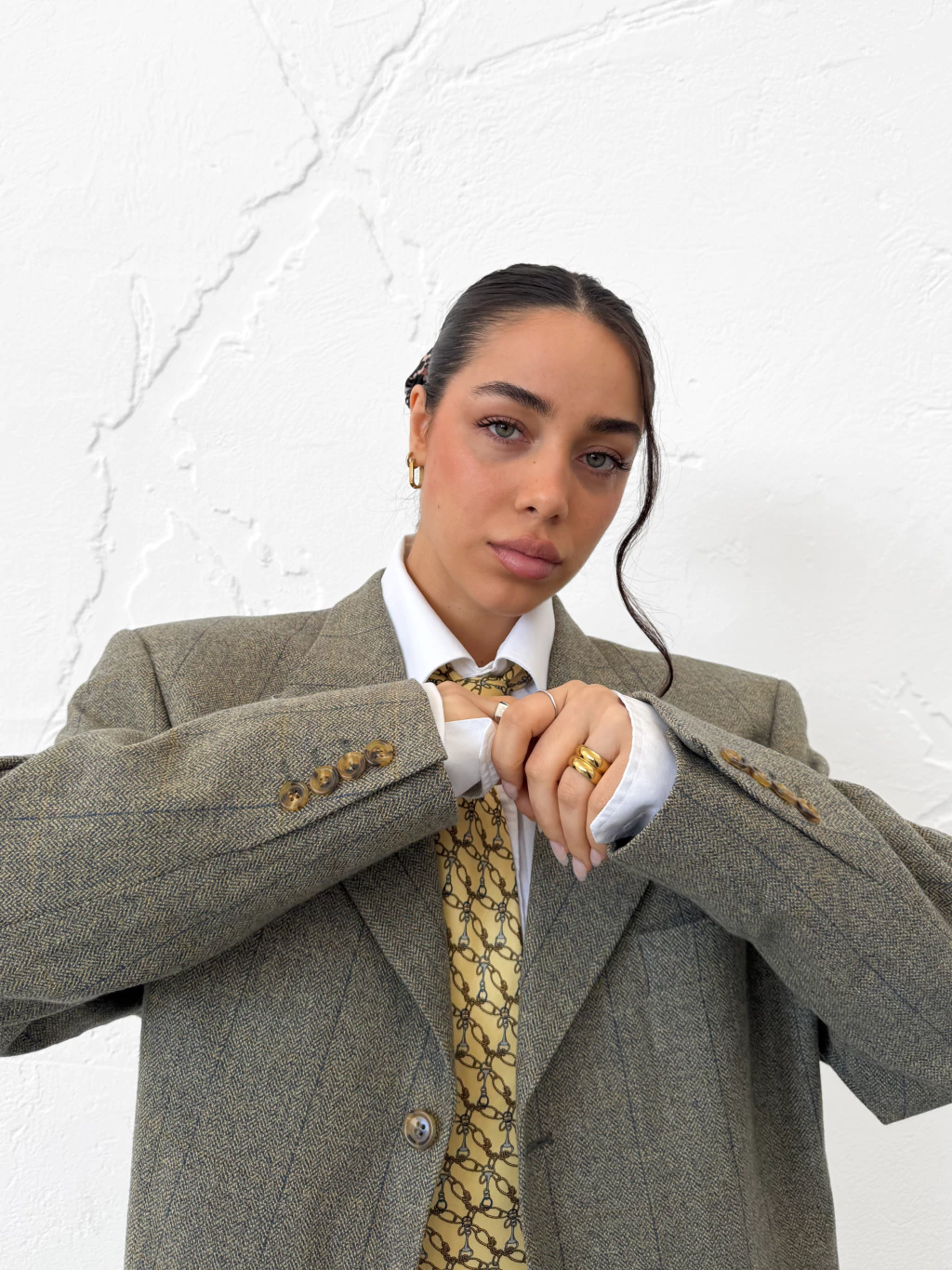 Descubrí el Pesto Vintage Blazer, una pieza de archivo que combina el poder del tailoring con la elegancia atemporal. Confeccionado utilizando textiles de alta calidad en color verde, con cuadros super sutiles en color azul y mostaza. Presenta hombros estructurados, forrería interna satinada y botones color oro y azul. Esta prenda fue seleccionada para formar parte de nuestro archivo por su calidad, terminaciones impecables y diseño atemporal. Es abrigado, pareciera ser de lana, pero no especifica la composición de la tela.