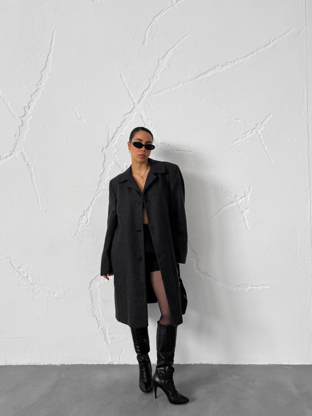 Descubrí el Sabrina Vintage Coat, una pieza de archivo que combina el poder del tailoring con la elegancia atemporal. Confeccionado utilizando 90% lana de alta calidad en color gris oscuro, presenta hombros estructurados, forrería interna satinada y botones a tono. Esta prenda fue seleccionada para formar parte de nuestro archivo por su calidad, terminaciones impecables y diseño atemporal. Está precioso, es super lindo y suave. Interior con pespuntes a mano.